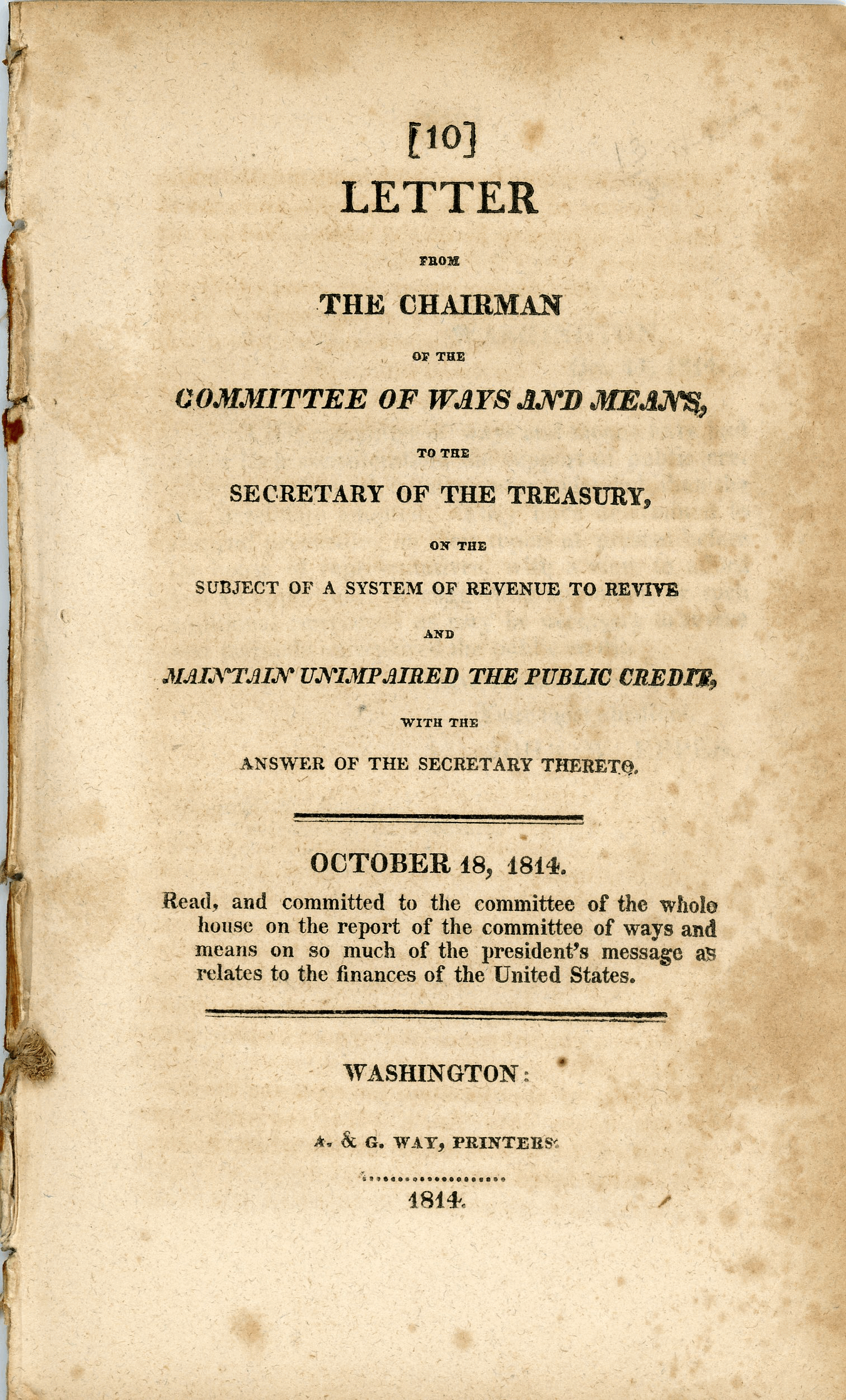 1814 Letter from the Chairman of Ways And Means, to the Secretary of the Treasury on the Subject of a System of Revenue to Revive and Maintain Unimpaired the Public Credit with the Answer of the Secretary Thereto