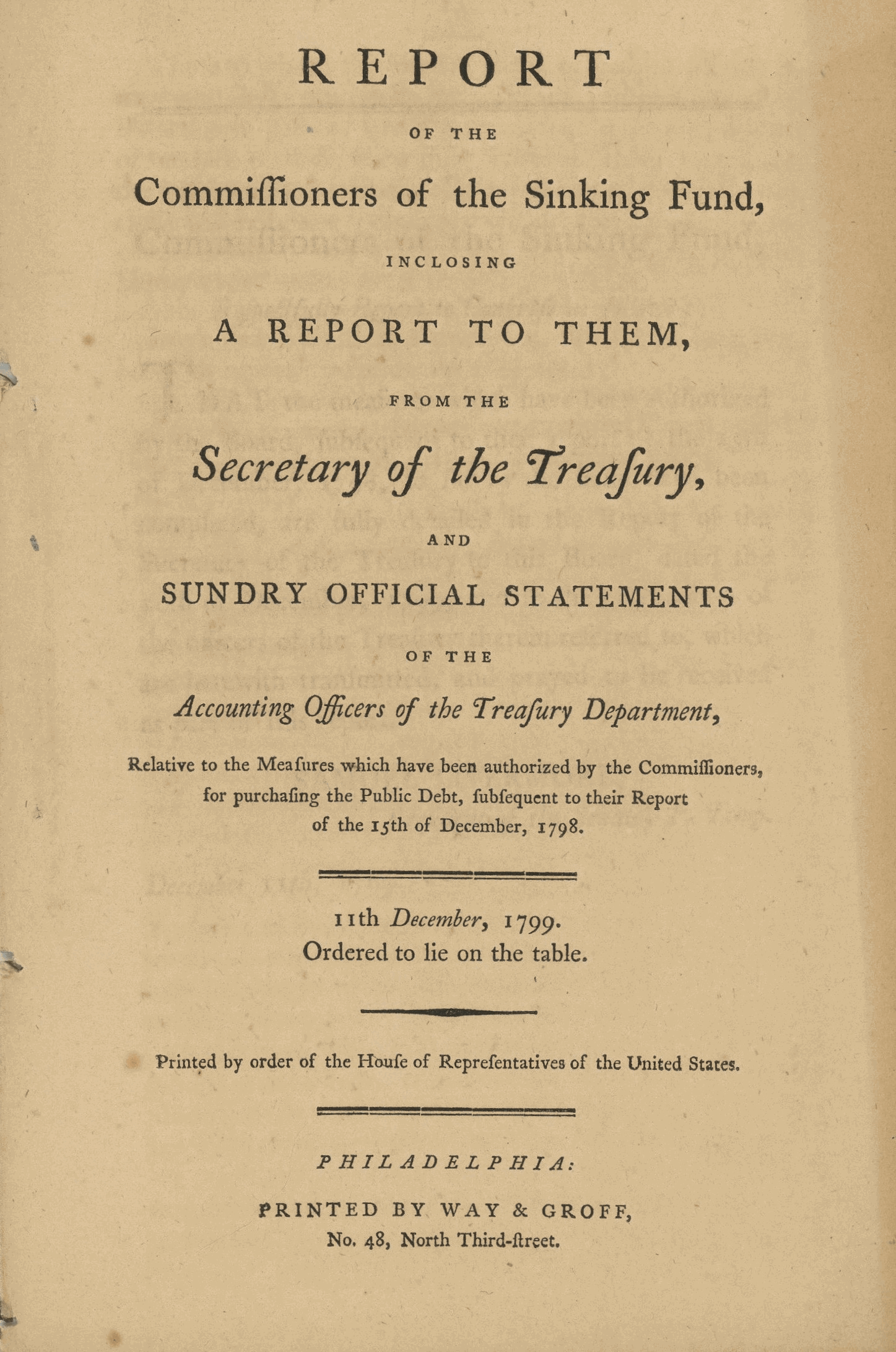 Rare copy, 1799, Printed by order of the House of Representatives, Way & Groff, Philadelphia, 12 pages
