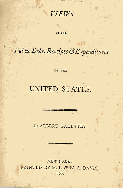 Authored in 1800 by Albert Gallatin, this famous report was highly critical of the nation's financial condition. Gallatin was the longest serving Treasury Secretary in American history (1801-1814), serving both Presidents Jefferson and Madison. He was responsible for the law requiring the Secretary's annual report to Congress. Prior to his appointment, Gallatin served in the House of Representatives, where he established the powerful Ways & Means Committee. A second edition of this report was printed in 1801 after Gallatin took office.